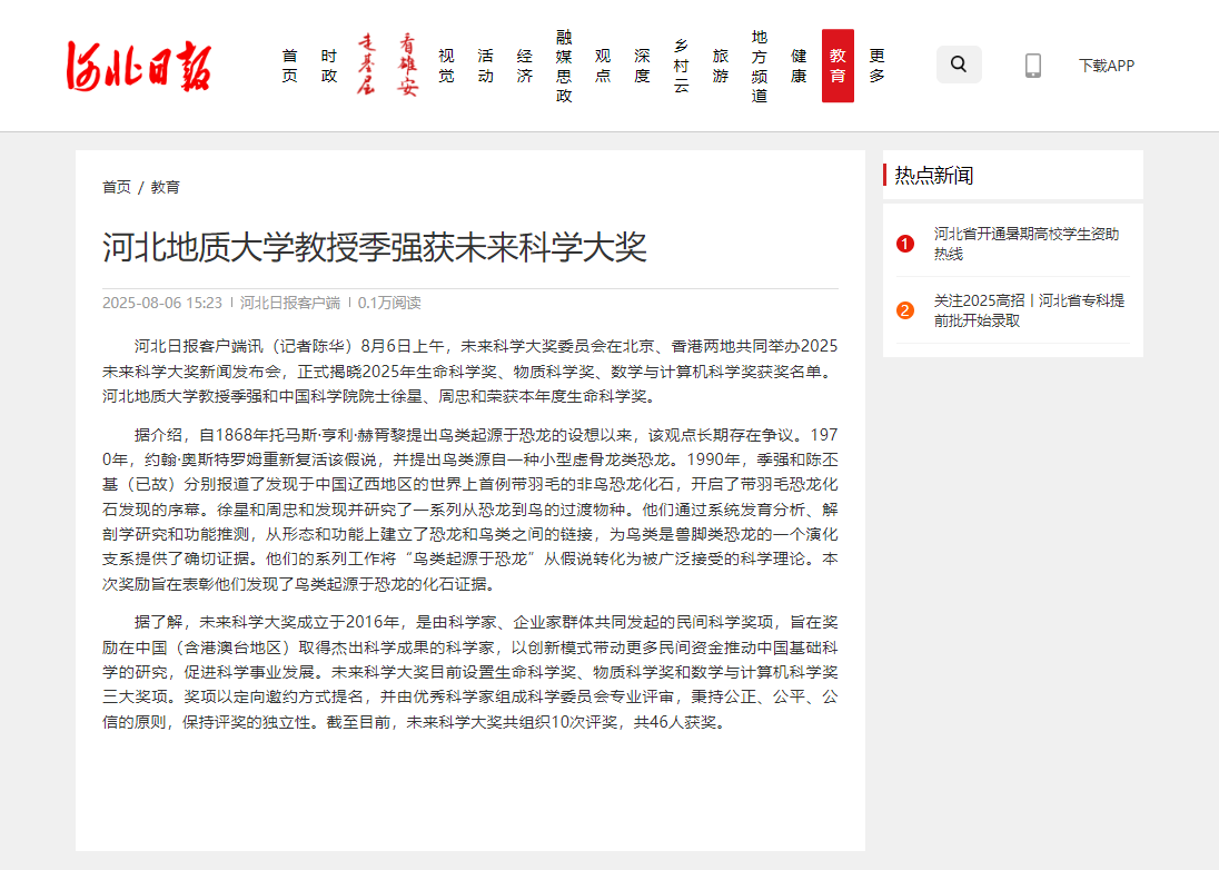 【河北日报】BB贝博艾弗森官网教授季强获未来科学大奖