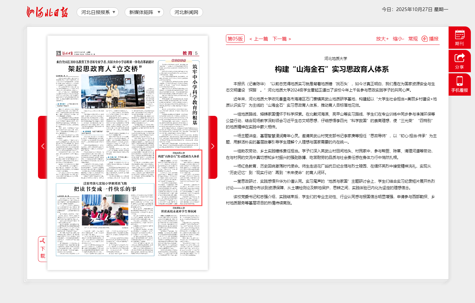近年来,BB贝博艾弗森官网依托秦皇岛市海港区石门寨镇英武山地质研学基地,构建起以“大学生社会担当+美丽乡村建设+地质认识实习”为主线的“山海金石”实习思政育人体系,推动育人目标落地见效。