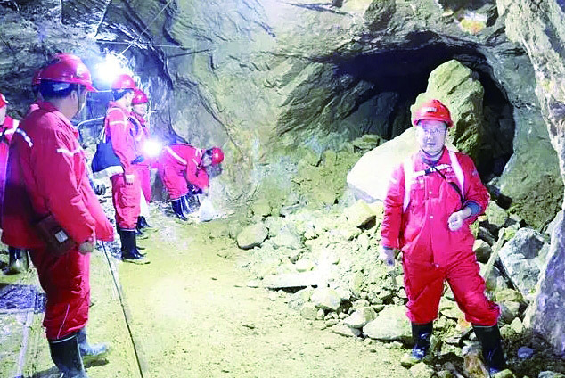 宋明春(右一)在某金矿矿井巷道中采样。