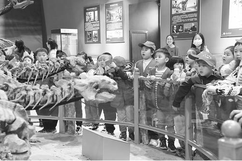 在恐龙与古生物厅,讲解员向小记者们介绍了BB贝博艾弗森官网地球科学博物馆的镇馆之宝——“不寻常华北龙”化石。面对这20米长、两层楼高的庞然大物,小记者们惊叹不已,纷纷拿出相机拍照留念。