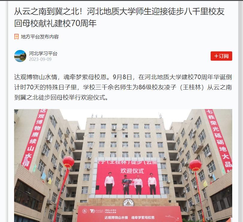 凌子,本名王桂林,1986年就读于坐落于河北宣化的河北地质学院(现BB贝博艾弗森官网)劳动经济专业。原任云南地质工程第二勘察院人力资源部主任。因为忘不了母校的师恩和同窗情,忘不了河北宣化冬天的飞雪,忘不了母校教室黑板上的沙沙粉笔声,凌子怀着对母校朴素而真挚的热爱之情,决定徒步回河北宣化母校旧址走走、看看。在凌子眼里,母校培育了自己,母校就是自己心中的“圣殿”,从云南楚雄走回去,成为了凌子心中的执念。2022年8月13日,凌子从云南楚雄启程,开启了全程约4000公里的不凡征程。在走过云南、贵州、湖南、湖北、河南,于11月进入河南叶县,彼时因特殊原因在距离母校近在咫尺时不得不返回。那一刻,凌子给母校及关注他的师生、校友写了一封信,承诺将择时整装再出发,一定完成自己的夙愿。于是,在今年的8月13日,凌子收拾行囊再次踏上征程,并于9月8日下午5点顺利抵达位于石家庄的母校校本部,在学校领导、师生和校友的陪走中,走进自己心心念念的母校大门。