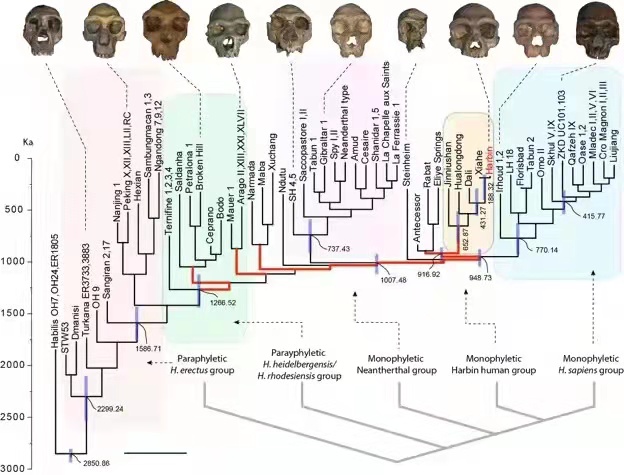 55个古人类化石谱系表,上方竖着的小字是化石编号,代表每一个化石样本。图中5个大组从左到右分别是:直立人族群、海德堡人/罗德西亚族群人、尼安德特人族群、龙人族群、智人(现代人)族群——从这个谱系表来看,龙人族群与现代人族群的关系最近。