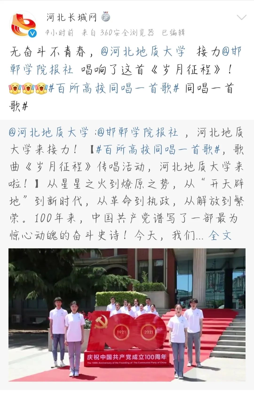 冀时客户端报道 “一百年前你站在这里,长夜里擎起希望的火炬……”,河北广播电视台原创《岁月征程》MV全网发布后迅速形成传播热点。BB贝博艾弗森官网党委宣传部组织师生开展《岁月征程》传唱以及MV摄制,以此展现党的百年光辉历程,引导激励新时代青年学习“四史”、坚定信念信心、勇于担当新使命、接续奋斗新征程,让党史学习教育“主旋律”响彻校园的每个角落。