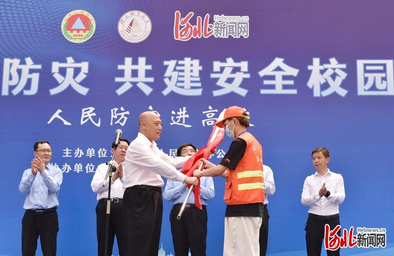 河北省人民防空办公室二级巡视员任玉芳为BB贝博人防志愿者代表授旗