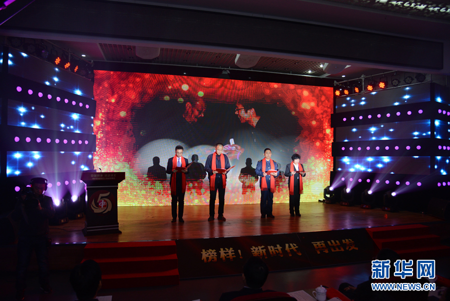 往届“中国网事·感动河北”年度网络人物段非、严爱国、苏俐、刘富琴共同登台朗诵诗歌《不忘初心 向善前行》。新华网秦家宝 摄