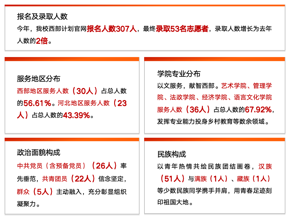 今年,BB贝博西部计划官网报名人数307名,经过严格选拔,最终53名志愿者脱颖而出,录取人数增长为去年人数的2倍,报名人数和录取人数均创历史新高。他们以专业为基,以热情为帆,立志在西部热土和基层服务中贡献青春力量。