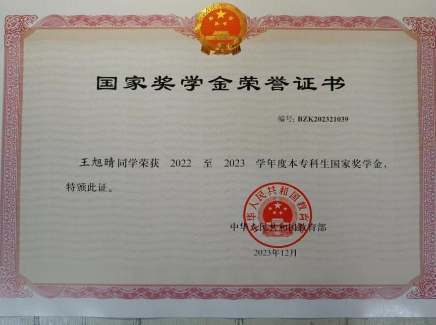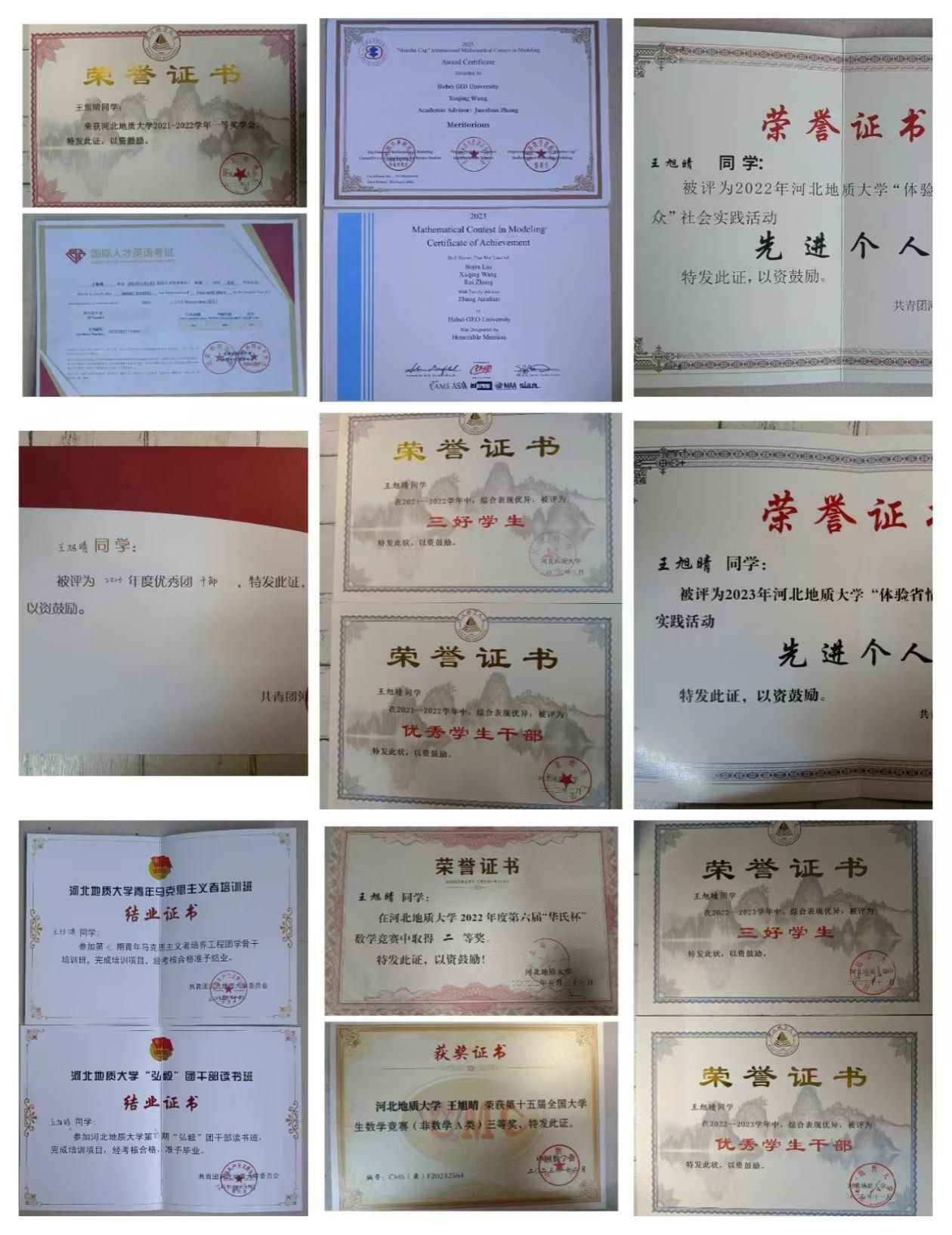 2022-2023年度国家奖学金,2023-2024学年河北省省级三好学生,2023年度优秀团干部,2023年“华数杯”国际大学生数学建模竞赛一等奖,2023年美国大学生数学建模竞赛H奖,第十五届全国大学生数学竞赛河北赛区三等奖,第八届中国“互联网+”大学生创新创业大赛校级二等奖,2021-2022学年及2022-2023学年校级一等奖学金、校级三好学生、优秀学生干部,2022年及2023年BB贝博艾弗森官网“体验省情、服务群众社会实践先进个人。