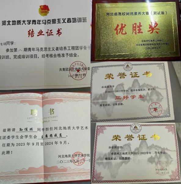 个人简介:孙佳琪,21级艺术艺术学院视觉传达设计二班学生,省三好学生获得者。