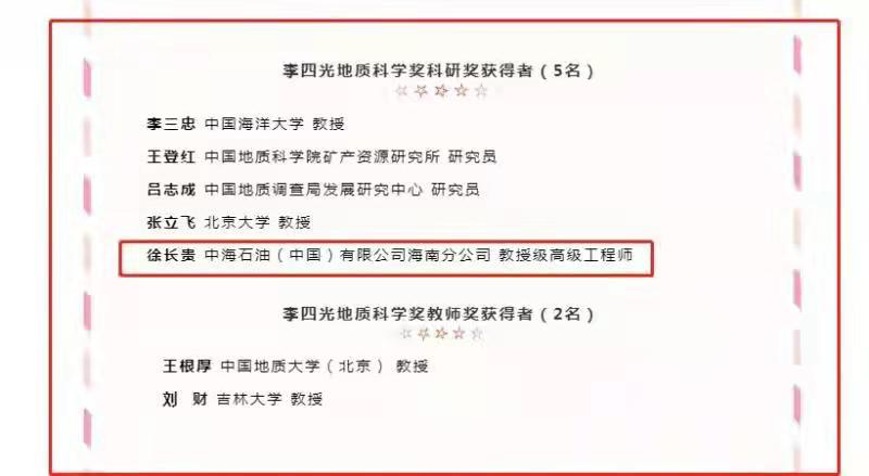 2021年8月28日李四光地质科学奖第九届委员会第三次会议终评选出第十七次李四光地质科学奖获奖者15名,其中:野外奖8名,科研奖5名,教师奖2名。