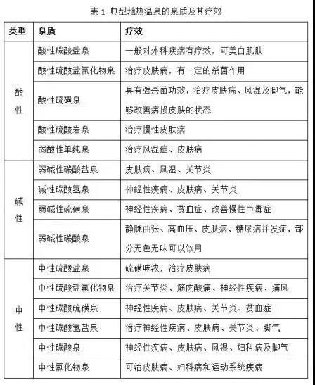 地热温泉近些年来越来越受大众的追捧,成为一种新的休闲和旅游时尚。泡温泉能够放松身心、消除疲劳、活络筋骨、减轻酸痛,对骨质疏松和血管收缩有一定的治疗效果。除此之外,因地热温泉含有丰富的化学成分,有不同的理疗功能。一些学者按照地热温泉所含的化学成分,将地热温泉分为氡泉、碳酸泉、碳酸氢钠泉、氯化钠泉、铁泉等。地热温泉也可按pH值(酸碱度)将其分为碱性地热温泉、酸性地热温泉、中性地热温泉(含混合中性)。一些典型的地热温泉的泉质及疗效见上表。